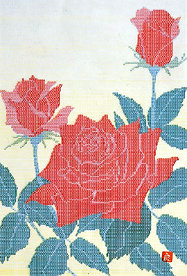 真っ赤なバラを描くのは五枚目で、切手の「花シリーズ」ので、下絵を描いてもらうのに、あさがおの時の様に又逆さに書かれてしまい、葉から描く事になりサッパリ解らなく、悩みながら描きました。